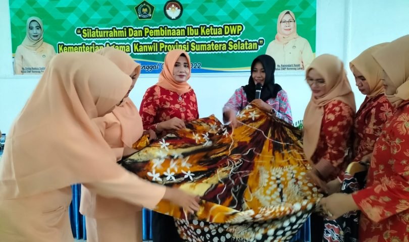 Kepala MAN 1 Lahat Di wakilkan Bendahara Nani Indarty, S.IP Memperkenalkan Batik hasil karya anak Keterampilan MAN 1 Lahat dengan Motif Panorama Kabupaten Lahat ( Bukit Serelo dan Peta Wilayah Kabupaten Lahat ). Dalam Acara Kunjungan Ketua Dharma Wanita Kantor Wilayah Kementerian Agama Provinsi Sumatera.Selatan Emilla Kontesa, S.Ag Beserta Rombongan Ke Dharma Wanita Kementerian Agama Kabupaten Lahat. Hadir Ketua Dharma Wanita Kantor Kementerian Agama kabupaten Lahat Hj. Raimin Darti, S.Pd Dan Pengurus Di AULA Kantor Kementerian Agama Kabupaten Lahat. Rabu, 1 Juni 2022
