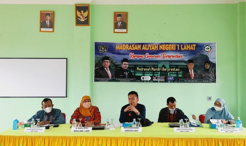 Dinas Perpustakaan Daerah Kabupaten Lahat Kabid Pengembangan Perpustakaan Dan Budaya Pembacaan Hendra Saputra, S.H,.MM didampingi Analiis Perpustakaan Azwar Rasyid, S.Ip Kunjungi MAN 1 Lahat sekaligus sosialisasi, kunjungan tersebut disambut baik oleh kepala MAN 1 Lahat Dra.Sumila, M.Pd.I didampingi Kepala Urusan TU Marno, S.Pd.I,. M.M, Wakil Kepala Madrasah, Kepala Asrama Dan TIM Akriditasi Perpustakaan MAN 1 Lahat Kamis, 24 Februari 2022