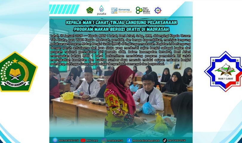 Lahat, 15 Januari 2026 — Kepala Madrasah Aliyah Negeri (MAN) 1 Lahat, Deni Ariani, S.Ag., M.M, bersama Kepala Urusan Tata Usaha, para Wakil Kepala Madrasah, serta seluruh pendidik dan tenaga kependidikan, meninjau langsung kegiatan Makan Bergizi Gratis (MBG) yang dilaksanakan di lingkungan madrasah. Kegiatan ini menjadi bagian dari program nasional pemerintah untuk meningkatkan gizi peserta didik di seluruh Indonesia.