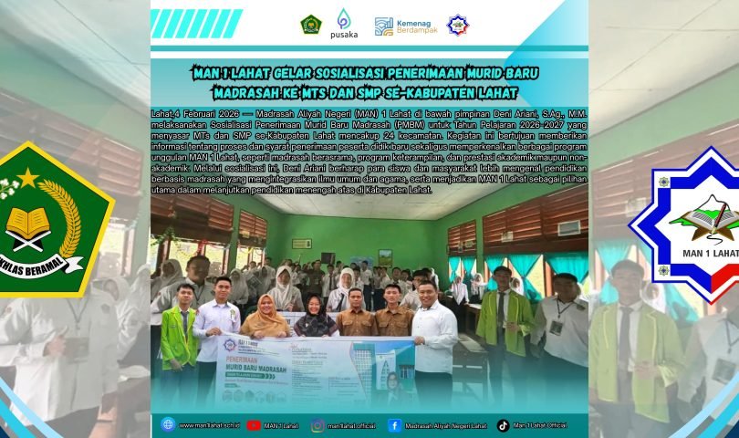 Lahat, 4 Februari 2026 — Madrasah Aliyah Negeri (MAN) 1 Lahat di bawah pimpinan Deni Ariani, S.Ag., M.M. melaksanakan kegiatan Sosialisasi Penerimaan Murid Baru Madrasah (PMBM) untuk Tahun Pelajaran 2026–2027. Kegiatan ini menyasar seluruh MTs dan SMP se-Kabupaten Lahat yang mencakup 24 kecamatan.