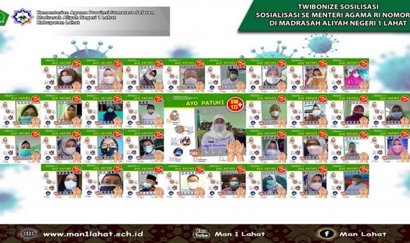 Kepala MAN 1 Lahat, Sumila menghimbau kepada pendidik dan tenaga kependidikan untuk menggunakan twibbonize prokes 5M yang bertujuan untuk menghimbau masyarakat untuk menerapkan 5M+1D yaitu Menjaga jarak, Memakai masker, mencuci tangan, menghindari kerumunan, membatasi mobilitas + Do’a .