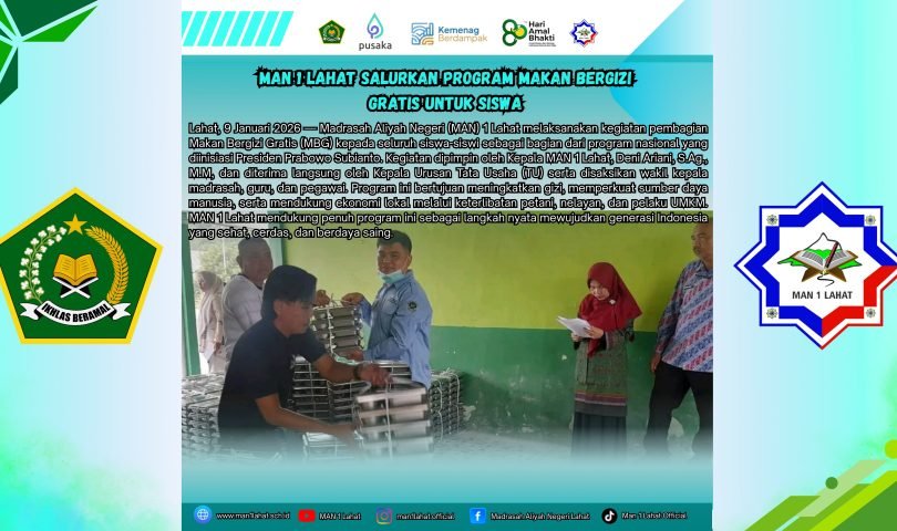 Lahat, 9 Januari 2026 — Madrasah Aliyah Negeri (MAN) 1 Lahat melaksanakan kegiatan pembagian Makan Bergizi Gratis (MBG) yang diberikan kepada seluruh siswa-siswi madrasah. Program ini merupakan bagian dari program nasional pemerintah Indonesia yang diinisiasi oleh Presiden Prabowo Subianto, dengan tujuan meningkatkan gizi, kualitas sumber daya manusia, dan pemberdayaan ekonomi lokal.