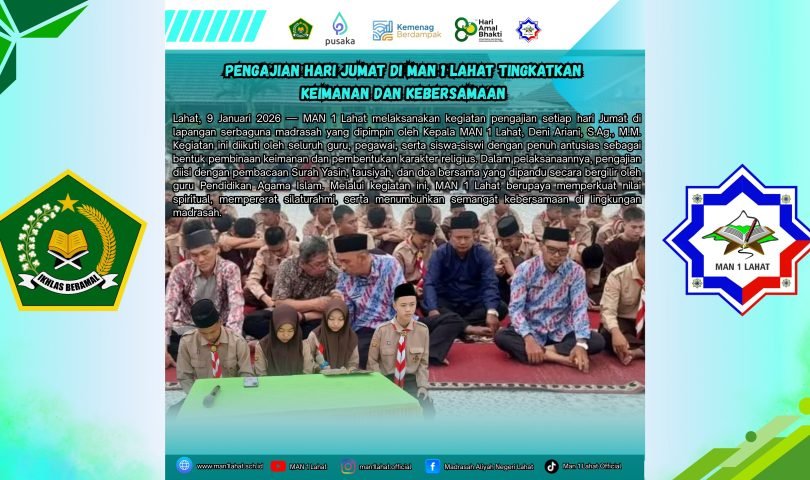 Lahat, 9 Januari 2026 — MAN 1 Lahat melaksanakan kegiatan pengajian setiap hari Jumat yang bertempat di lapangan serbaguna madrasah. Kegiatan ini menjadi salah satu bentuk pembinaan keagamaan bagi seluruh warga madrasah dalam menumbuhkan keimanan, ketakwaan, serta mempererat kebersamaan di lingkungan sekolah.